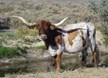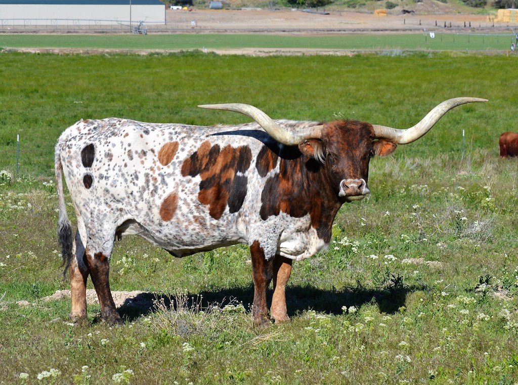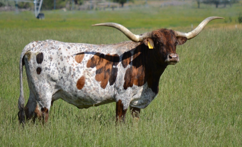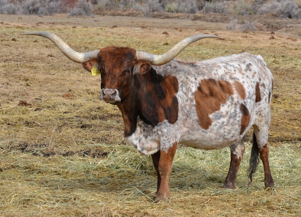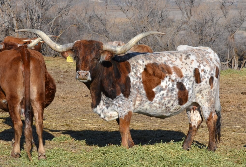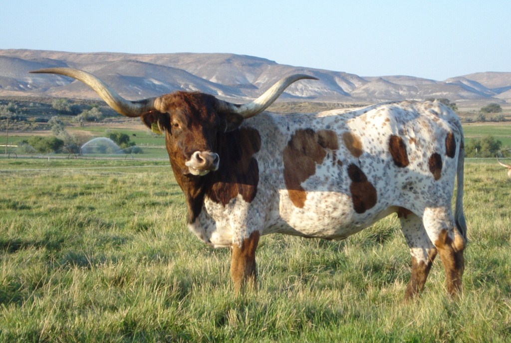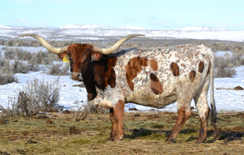 Great brindle and white cow with thick twisted horns that are over 72". We are very pleased to have this cow in the herd.